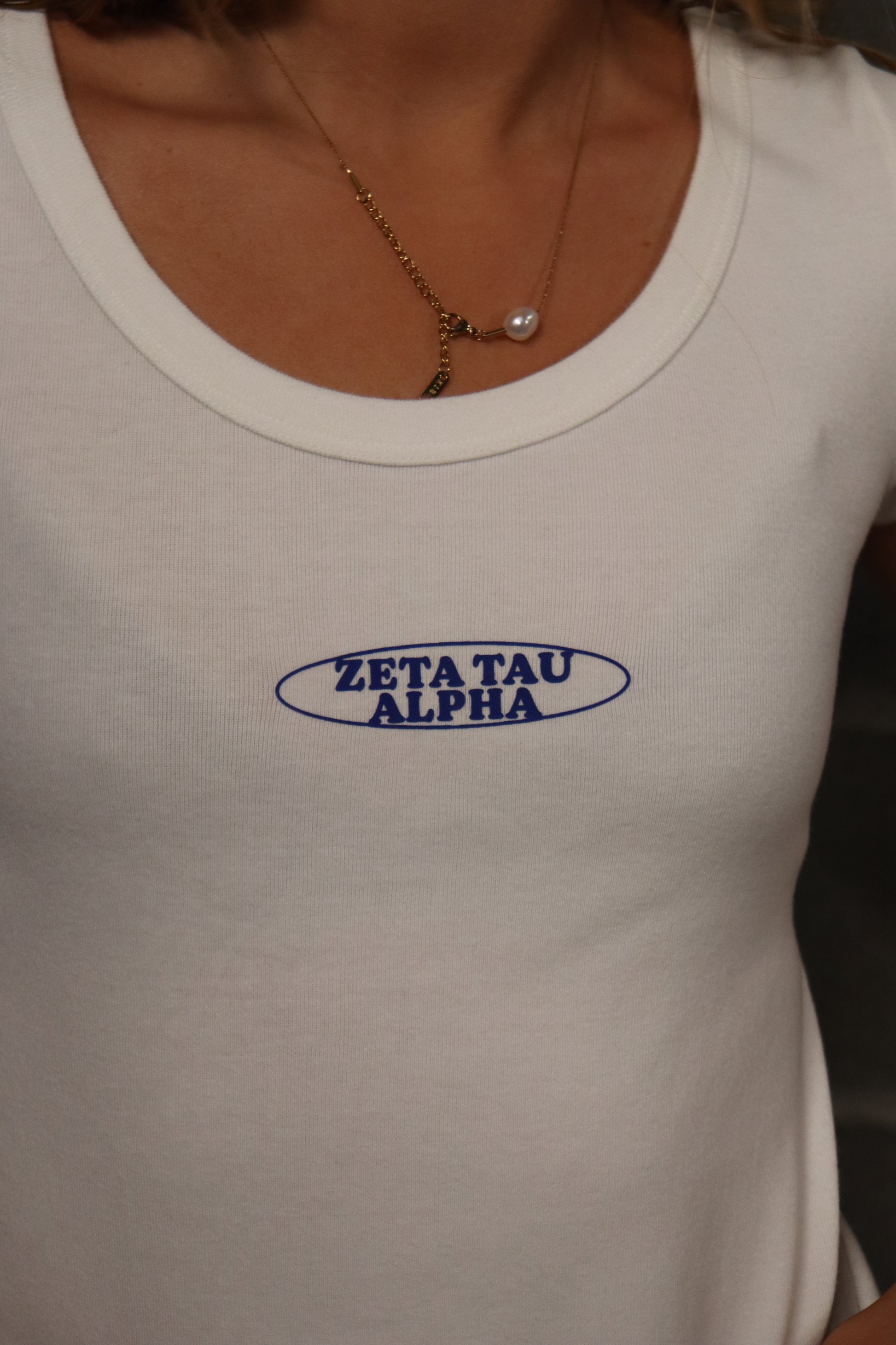 Get cozy and cool with the Brandy Melville Zelly Long Top in cream! Featuring a charming navy circular "Zeta Tau Alpha" logo, this playful tee adds a fun twist to your casual look. Soft, comfy, and effortlessly stylish—it's perfect for lounging or making a statement wherever you go.